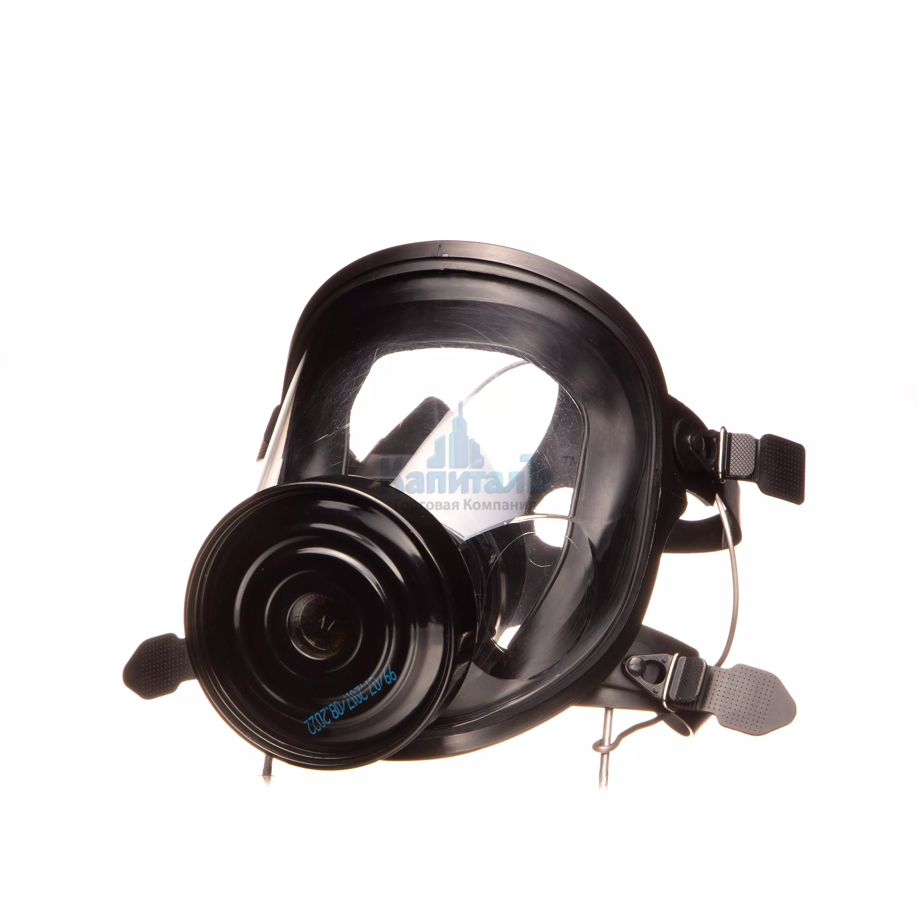 Человек надевает промышленный противогаз на лицо, сзади определяет оптимальный режим натяжения лямок;